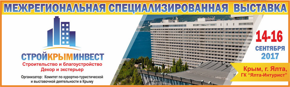 Приглашаем специалистов строительных компаний, а также профессионалов, занимающихся проектированием, отделкой зданий и сооружений и дизайном интерьеров, предприятия оптовой и розничной торговли, инвестиционные, банковские, страховые компании принять участие в выставке «СтройКрымИнвест», которая начнет свою работу в г. Ялта, ГК «Ялта-Интурист» с 14 по 16 сентября 2017 г.